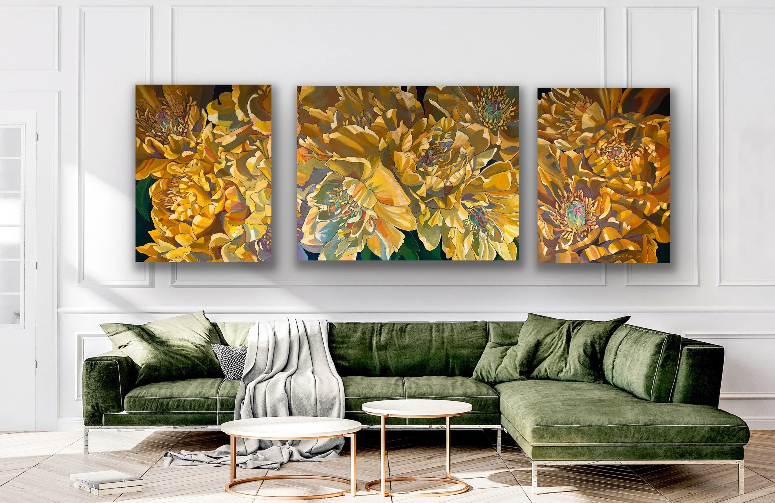 Two years ago, this large peony triptych was painted in many colors. Over time, something shifted, and I felt called to change it to all yellow peonies. Giving myself permission to change my mind became an act of trust, and reworking the piece unfolded with ease and joy.